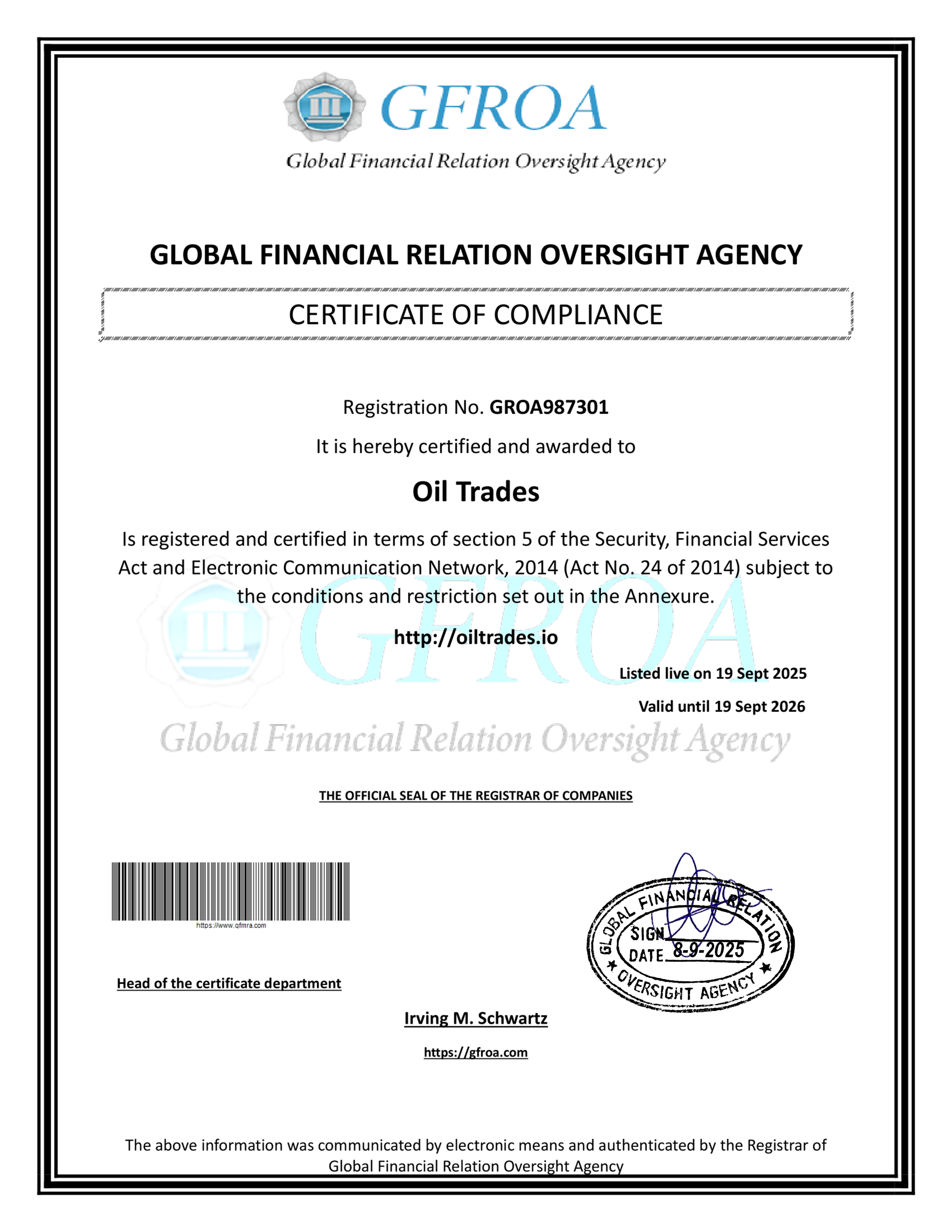 Oil trades company Certificate of compliance